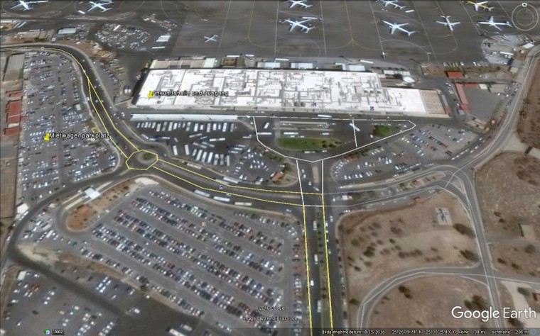 Das Foto stammt von google earth. Ich habe einmal den Parkplatz und die Ankunftshalle markiert. Die rechte Seite des Airports ist die Abflughalle.