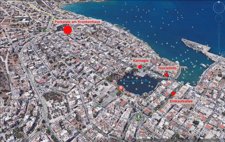 Auf dem Rückweg zum Haus können Sie in einer der Tavernen Kritsá einkehren oder aber Sie fahren nach Agios Nikolaos an den Voulusmeni See. Agios Nikolaos gilt auch als das St. Tropez Kretas. Entlang des Volousmeni Sees gibt es zahlreiche Tavernen. Das Karnagio am großen gepflasterten Platz am See ist ganzjährig geöffnet und wird auch von den Kretern gerne selbst besucht. Der Hinweis ist wohl recht deutlich, oder? Wo können Sie parken? Mutige können entlang der steilen Ausfallstraße in Richtung Krankenhaus parken. Wir bevorzugen den Parkplatz am Krankenhaus selbst. Dort ist ausreichend Platz. Auf dem Google Earth Bild ist der Parkplatz eingezeichnet. Von hier läuft man dann die Straße runter.