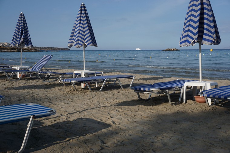 Fahren Sie am Kreisel beim Krankenhaus die dritte Ausfahrt (Straße führt den Berg hinunter, das Krankenhaus liegt auf der linken Seite) ab. Sie kommen dann wieder an dem kleinen Kreisel nahe des A+B Supermarktes raus. Nehmen Sie die Geschäftsstraße, die aus dem Ort herausführt. Sie erreichen dann wieder die große – etwas unübersichtliche - Kreuzung am Ortseingang. Hier biegen Sie scharf links in Richtung Almyros Beach ab. Parken können Sie direkt am Strand und am Abend ist auch nicht mehr so viel los. Sie haben den Strand zwar wohl nicht für sich ganz allein, aber doch fast ganz allein. Die All-Inklusive Urlauber strömen nämlich jetzt an Ihre Buffets. Hier an diesem feinen Sandstrand mit einem seichten Wellenschlag können Sie ganz weit in das Meer hineinlaufen. Das Wasser ist ab Mai/Juni warm. Hier können Sie ganz hübsch entspannen.