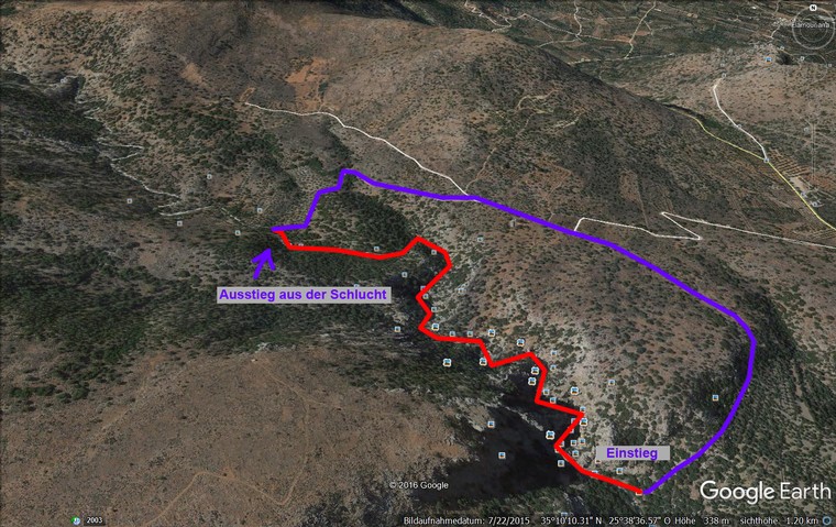 Theoretisch können Sie die Schlucht bis Tapes durchlaufen. In diesem Tagesvorschlag sollten Sie aber an einem der besagten Maschendrahtzäune an einer Talerweiterung nach der Klamm rechts in einen Olivenhain abbiegen. Abbiegen heißt, dass Sie eine kleine Böschung von ca. 1m Höhe erklettern. Aufgemerkt. Diese Stelle ist ein wenig schwer auszumachen. Ich füge mal ein Google Earth-Bild ein, um die Stelle zu verdeutlichen. Wenn Sie durch diesen Hain laufen, kommen Sie auf einen befestigten Feldwirtschaftsweg. Diesem folgen Sie beständig auf die Höhe. Von hier bekommen Sie noch einmal die Gelegenheit auf den Felsdurchbruch der Schlucht zu schauen.