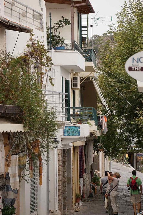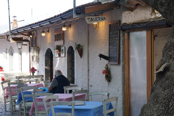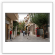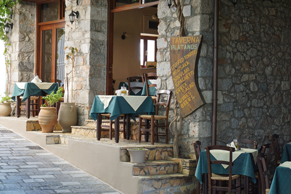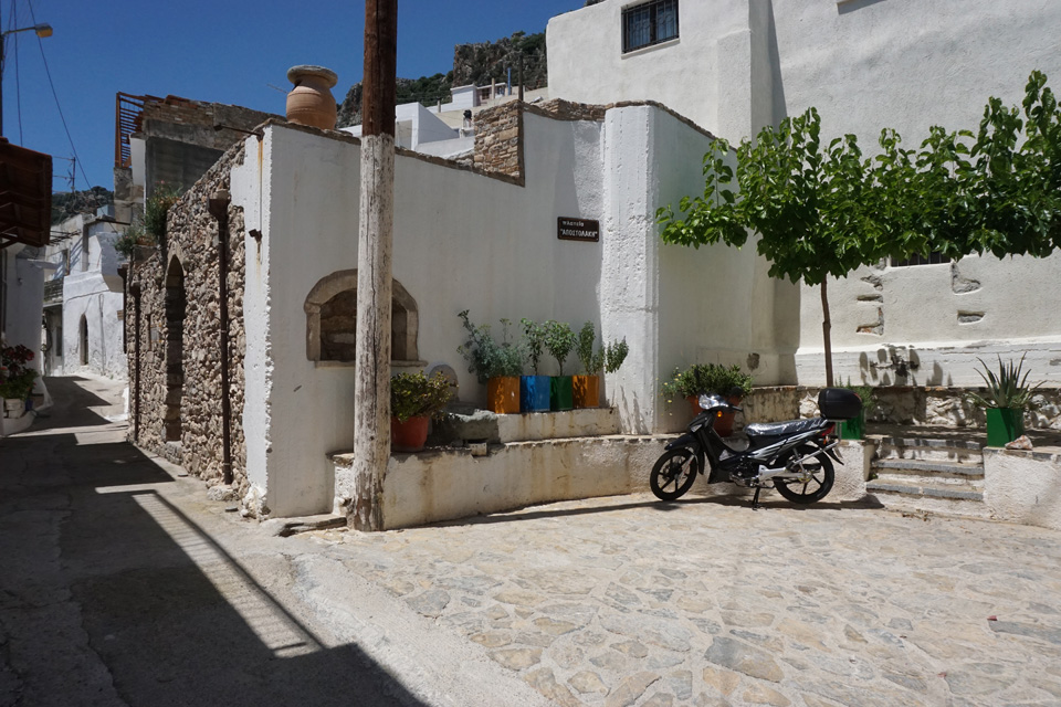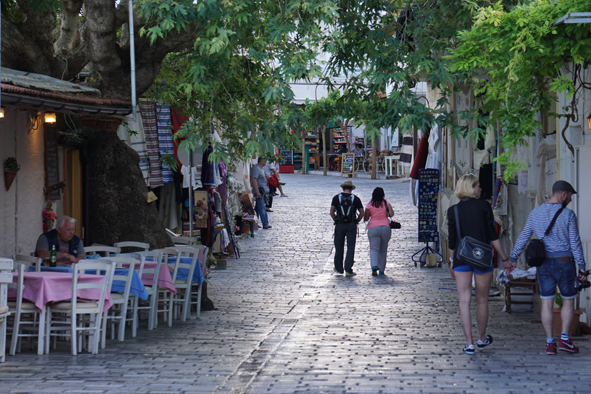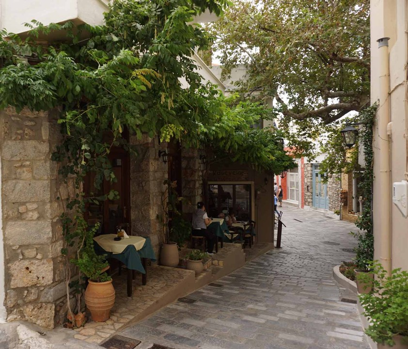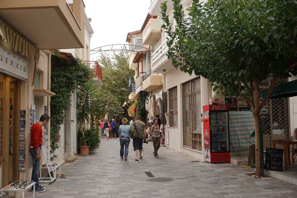 Zahlreiche Tavernen mit leckerem, mediterranem Essen und Geschäfte für den täglichen Bedarf, Souvenirs und Kunstgewerbe sind fußläufig in Nähe des Hauses zu erreichen. In der Einkaufsstraße lassen sich Olivenöle, Textilwaren, Lederschuhe, Ledergürtel, Naturseifen, Keramik und vieles mehr erwerben. Eine weitere Einkaufsmöglichkeit, eine Filiale des Discounters Lidl, liegt auf dem Weg nach Agios ca. 5 min Fahrstrecke entfernt. Ein Bankautomat ist in der Hauptstraße des Dorfes, ca. 150 m vom Haus entfernt.